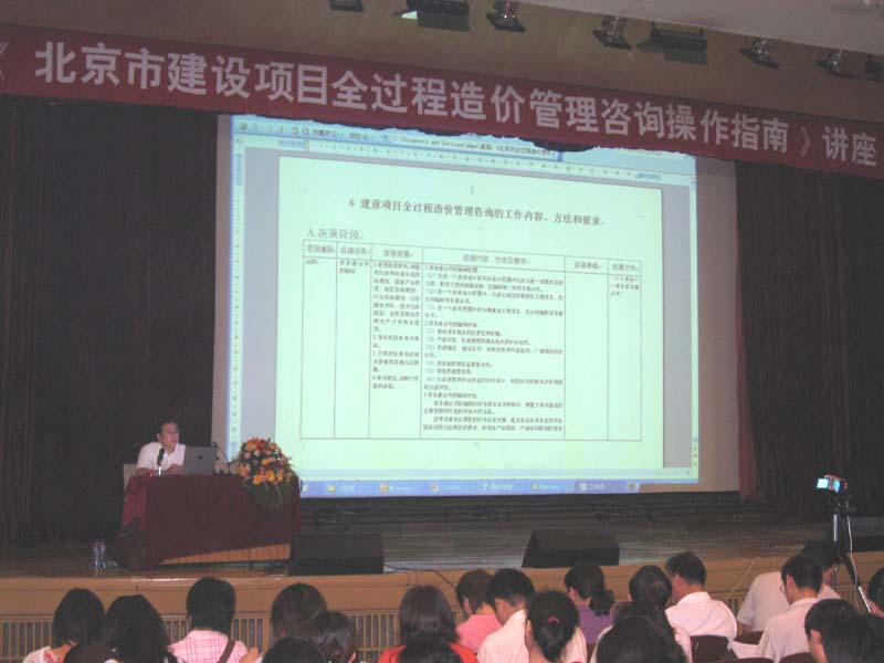 為更好的貫徹落實(shí)《指南》的執(zhí)行,2007年8月8日,由北京市建設(shè)工程造價(jià)管理協(xié)會(huì)組織,在中國建筑科學(xué)研究院禮堂舉辦了《北京市建設(shè)項(xiàng)目全過程造價(jià)管理咨詢操作指南》講座,對(duì)全市三百多家工程造價(jià)咨詢企業(yè)進(jìn)行《指南》的宣貫,由公司董事長(zhǎng)周和生對(duì)《指南》的操作作了全面的介紹和重點(diǎn)的講解。