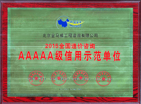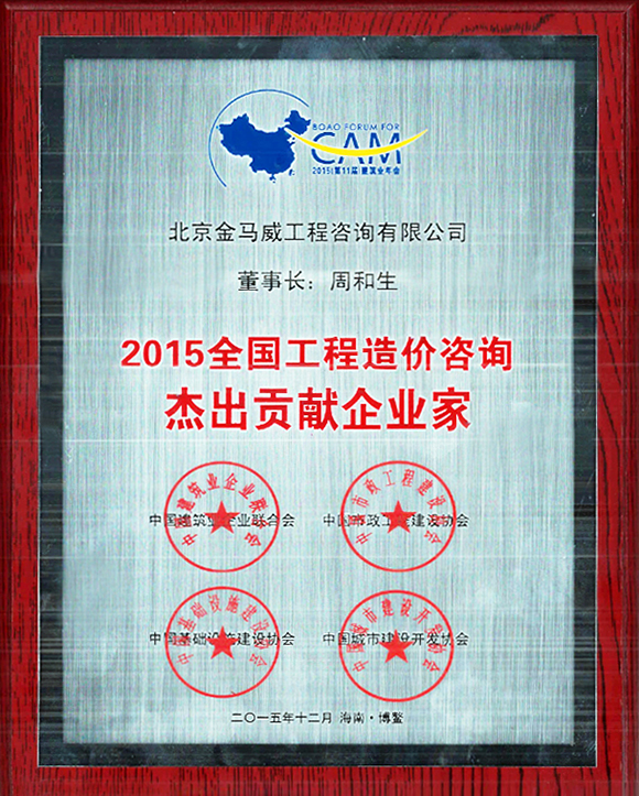 2015年12月25日,由中國(guó)建筑業(yè)企業(yè)聯(lián)合會(huì)發(fā)起,聯(lián)合中國(guó)基礎(chǔ)設(shè)施建設(shè)協(xié)會(huì)、中國(guó)市政工程建設(shè)協(xié)會(huì)等單位聯(lián)合主辦的“博鰲論壇·2015(筑業(yè)年會(huì)”在海南博鰲順利召開(kāi), 年會(huì)現(xiàn)場(chǎng)同時(shí)發(fā)布了2015年度優(yōu)秀企業(yè)和優(yōu)秀人物等以及2015中國(guó)建筑業(yè)優(yōu)秀企業(yè)和人物的頒獎(jiǎng)榜單,金馬威榮獲“2015全國(guó)造價(jià)咨詢AAAAA級(jí)信用示范單位”,周和生董事長(zhǎng)榮獲“2015全國(guó)工程造價(jià)咨詢杰出貢獻(xiàn)企業(yè)家”榮譽(yù)稱(chēng)號(hào)。