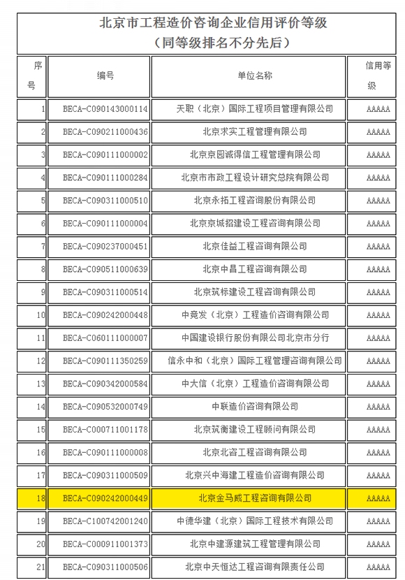 本次評選活動專家組按照中價協(xié)《工程造價咨詢企業(yè)信用評價標準》規(guī)定,分別到咨詢企業(yè)現(xiàn)場核查了造價咨詢成果文件,企業(yè)檔案管理和職工的社會保障,以及黨建、工會的建立等資料。最后集中所有專家對咨詢企業(yè)申報的資料并結合現(xiàn)場核查情況,依據(jù)信用評價標準評審出了177家工程造價咨詢企業(yè)信用等級的結果,我公司榮獲北京市工程造價咨詢企業(yè)信用評價5A級企業(yè)。